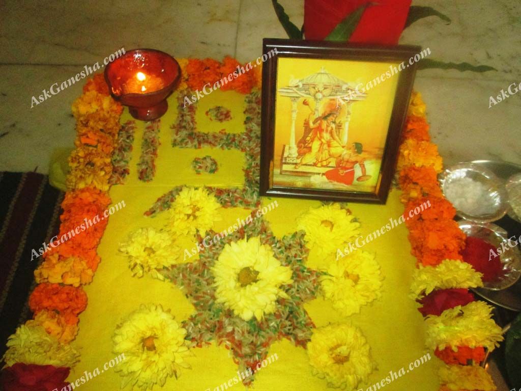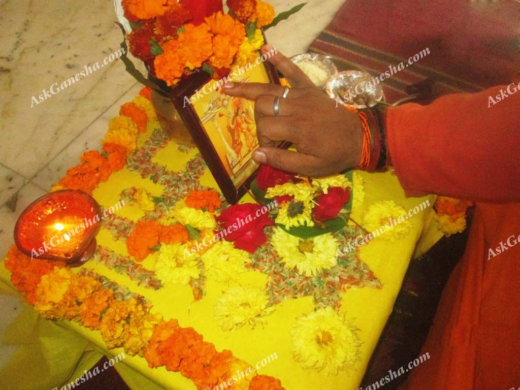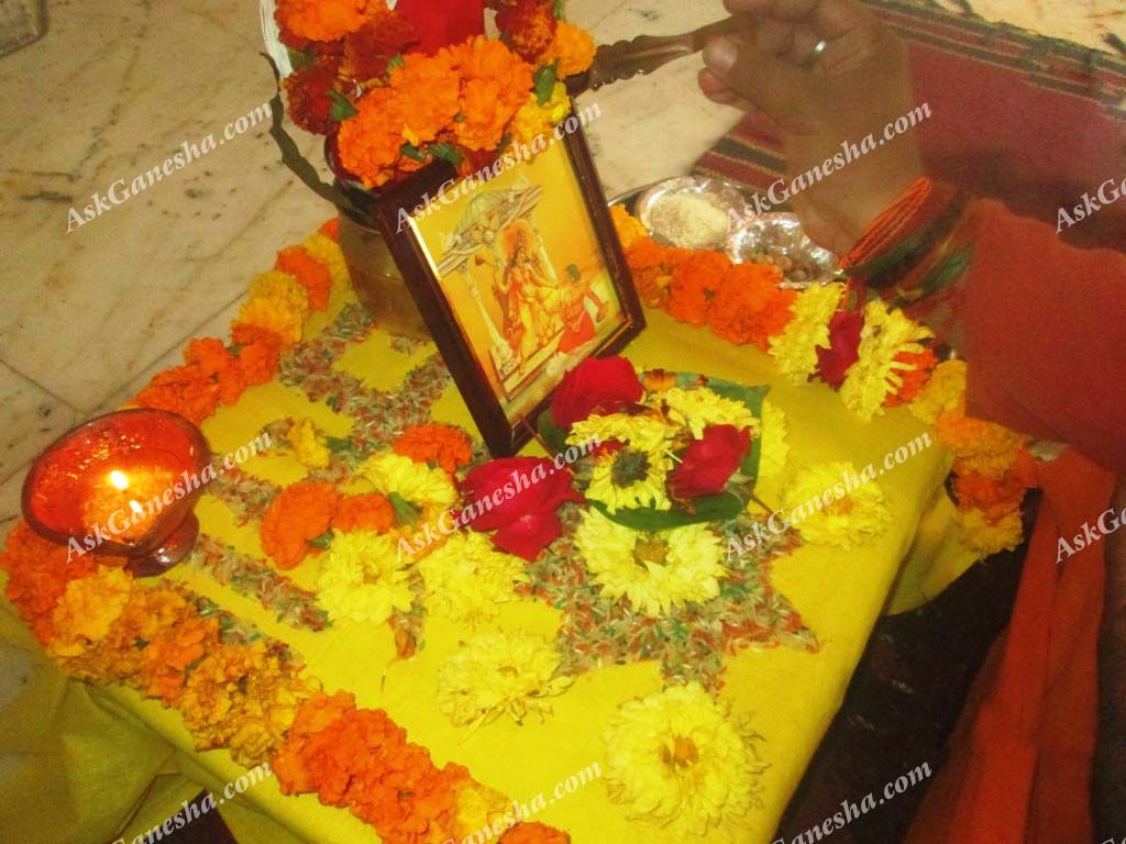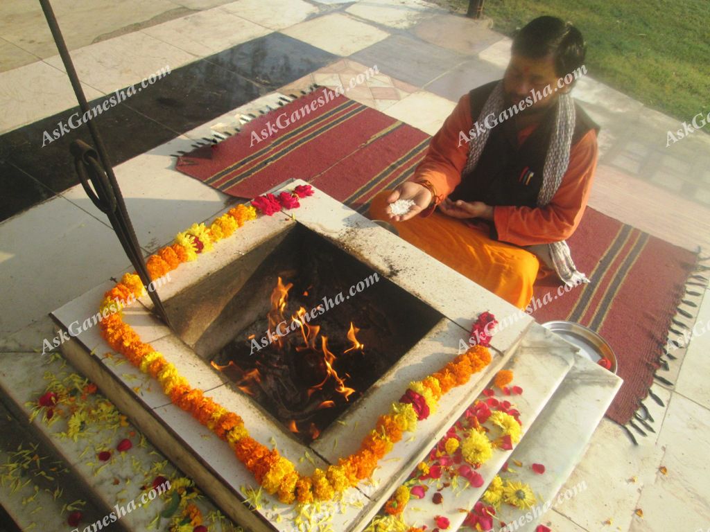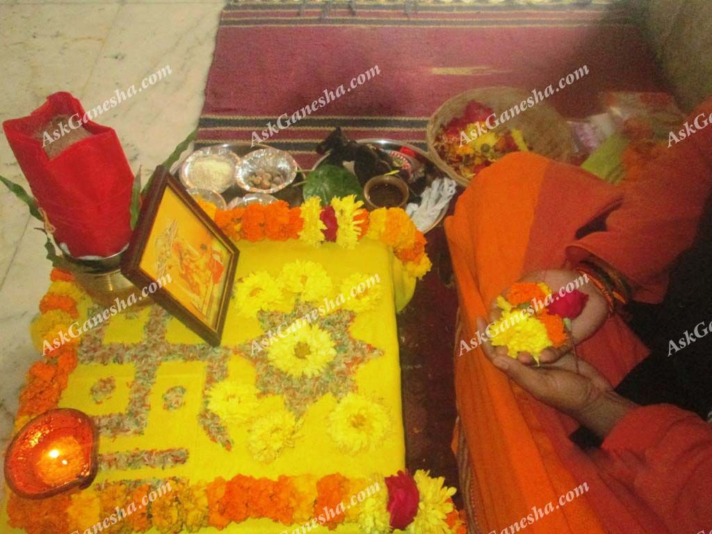 This is an aesthetic step which brings us closer to the yagya. In this procedure, the priests and the attendees offer flowers to the dieties’ statues or photographs. Offering flowers in the feet of the Gods/Goddesses is a kind of showing affection and respect towards them. It is an act of pleasing the deities.