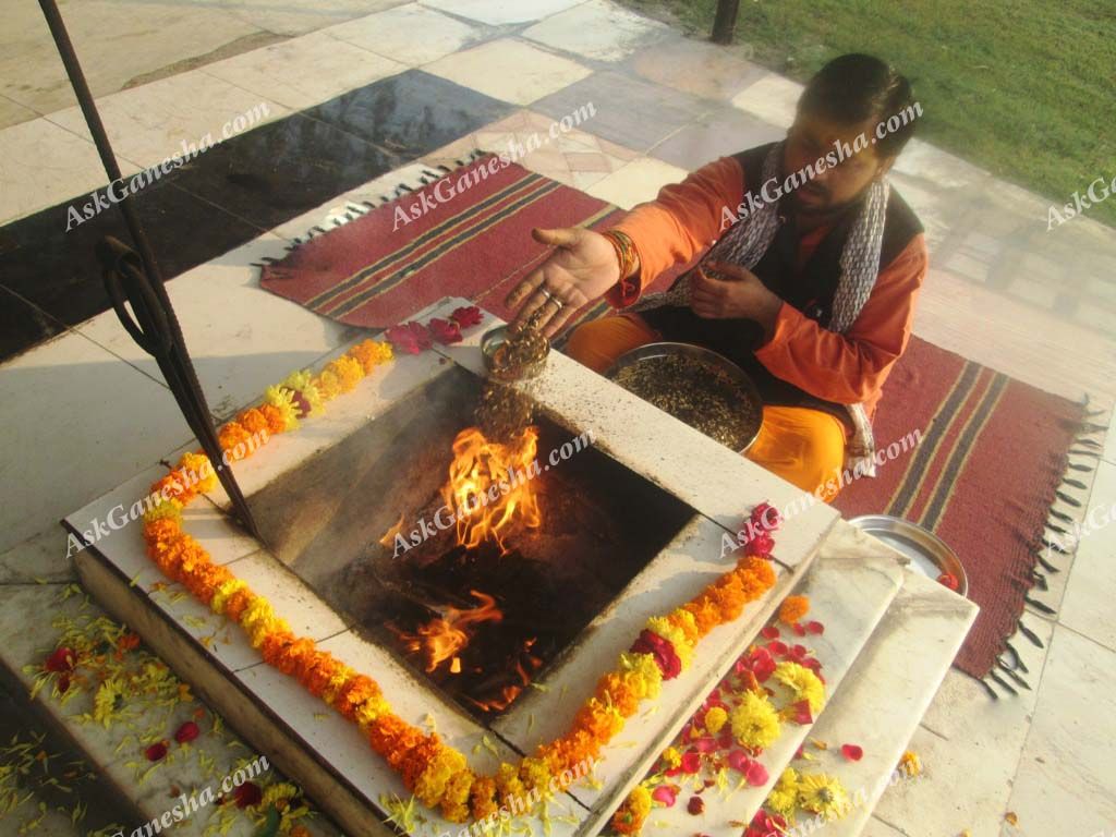 This is an aesthetic step which brings us closer to the yagya. In this procedure, the priests and the attendees offer flowers to the dieties’ statues or photographs. Offering flowers in the feet of the Gods/Goddesses is a kind of showing affection and respect towards them. It is an act of pleasing the deities.
