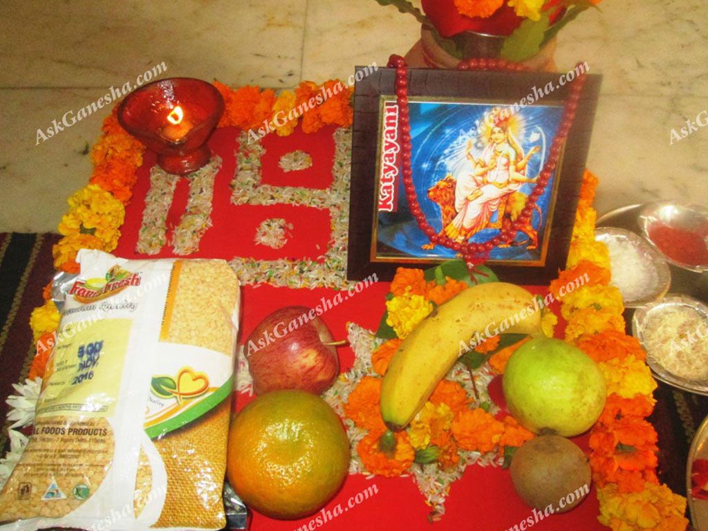 Maa Katyayani becomes pleased with things like honey, jaggery and roasted Chana or Bengal grams. Honey is considered one of the most important offerings to appease Maa Katyayani, especially for obtaining good academic results. One should also offer Ganga Jal, Camphor, Kumkum, Rice and sweets. One should also light Diya of pure ghee along with dhoop.
