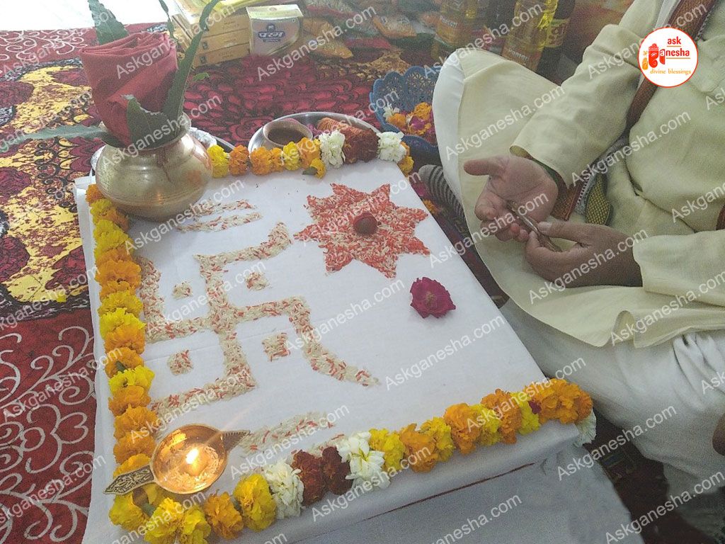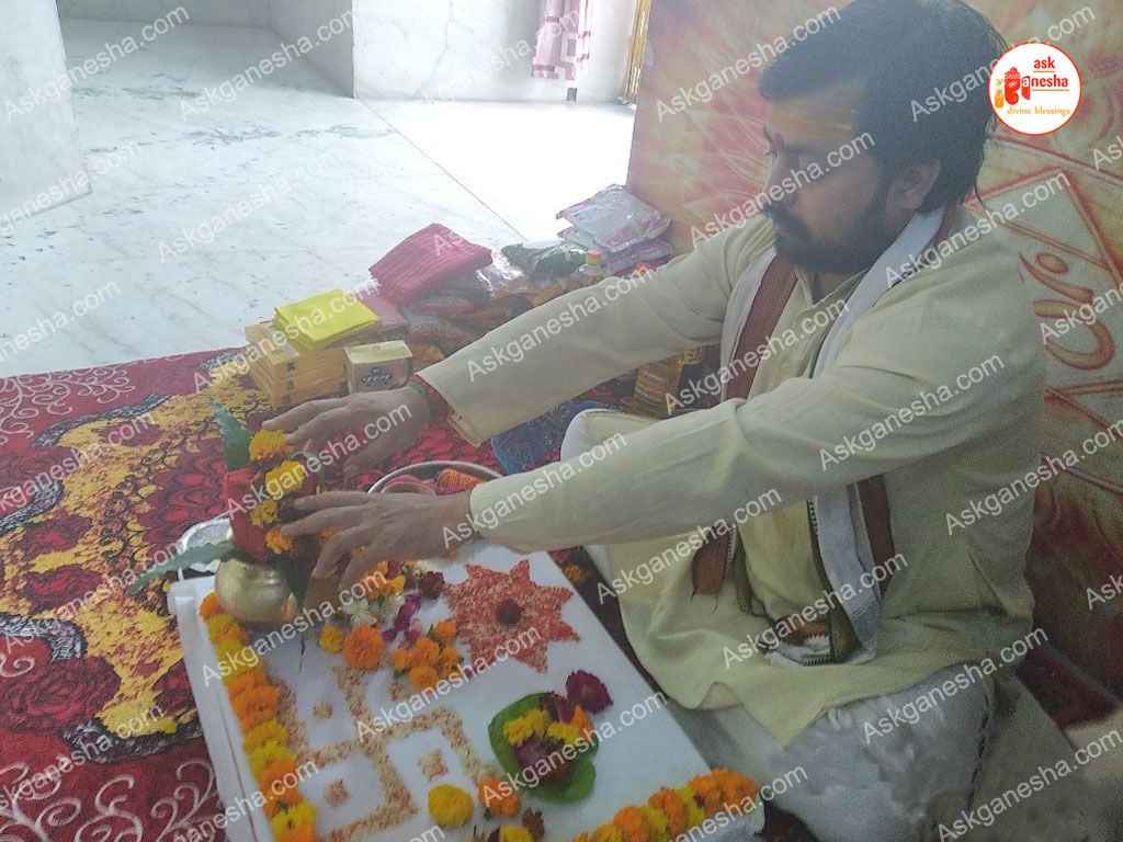 This is an aesthetic step which brings us closer to the yagya. In this procedure, the priests and the attendees offer flowers to the dieties’ statues or photographs. Offering flowers in the feet of the Gods/Goddesses is a kind of showing affection and respect towards them. It is an act of pleasing the deities.