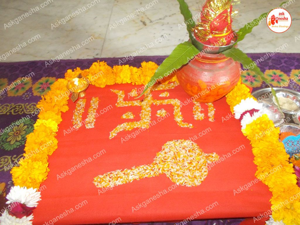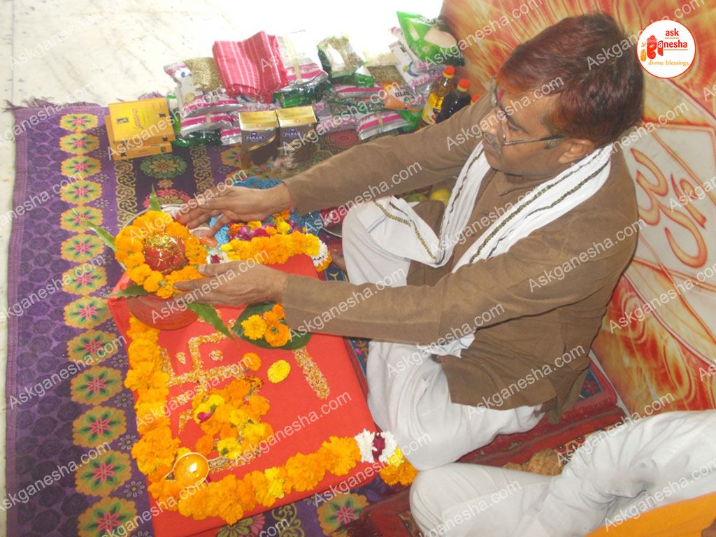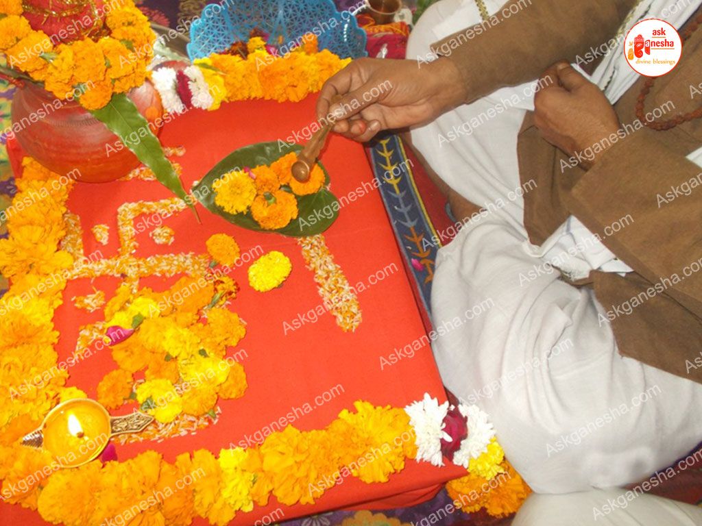 This is an aesthetic step which brings us closer to the yagya. In this procedure, the priests and the attendees offer flowers to the dieties’ statues or photographs. Offering flowers in the feet of the Gods/Goddesses is a kind of showing affection and respect towards them. It is an act of pleasing the deities.