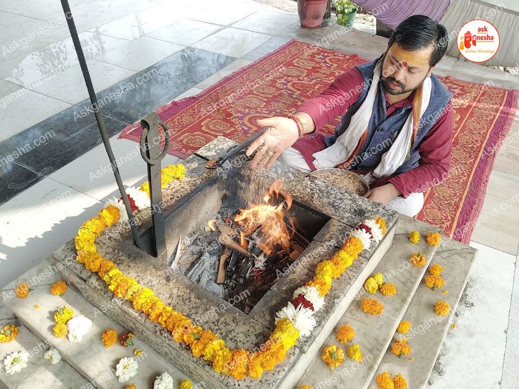 This is the first step of the Vidhi. In this step, the priests performing the yagna welcomes Lord Ganpati and other Gods and Goddesses through mantra chanting. This is an important part of the yagya as it builds the strength of the yagna and pooja. Avahaan is an attempt to invite the Lords to honour the yagna.