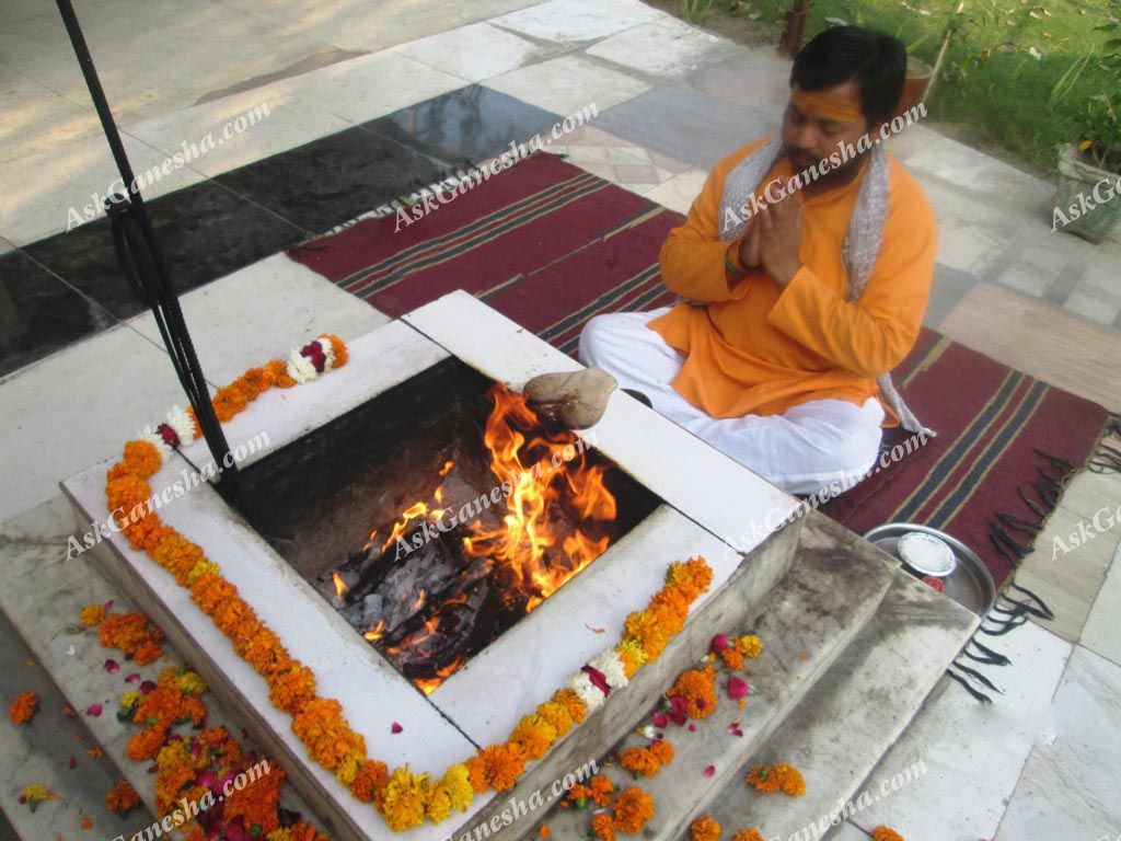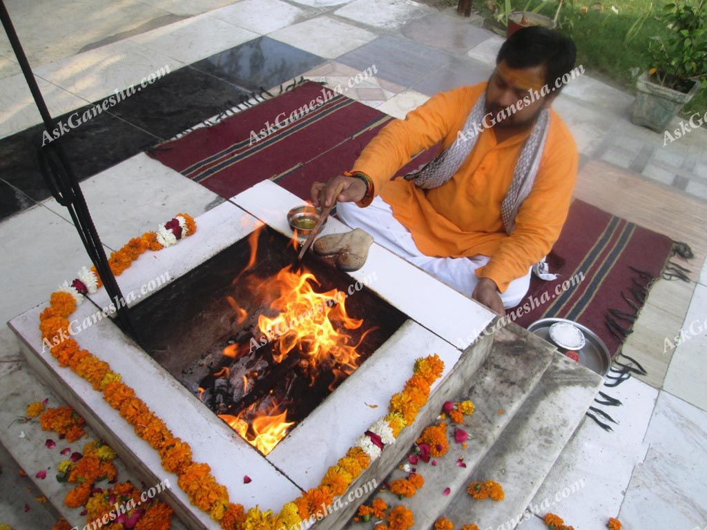 This is an aesthetic step which brings us closer to the yagya. In this procedure, the priests and the attendees offer flowers to the dieties’ statues or photographs. Offering flowers in the feet of the Gods/Goddesses is a kind of showing affection and respect towards them. It is an act of pleasing the deities.