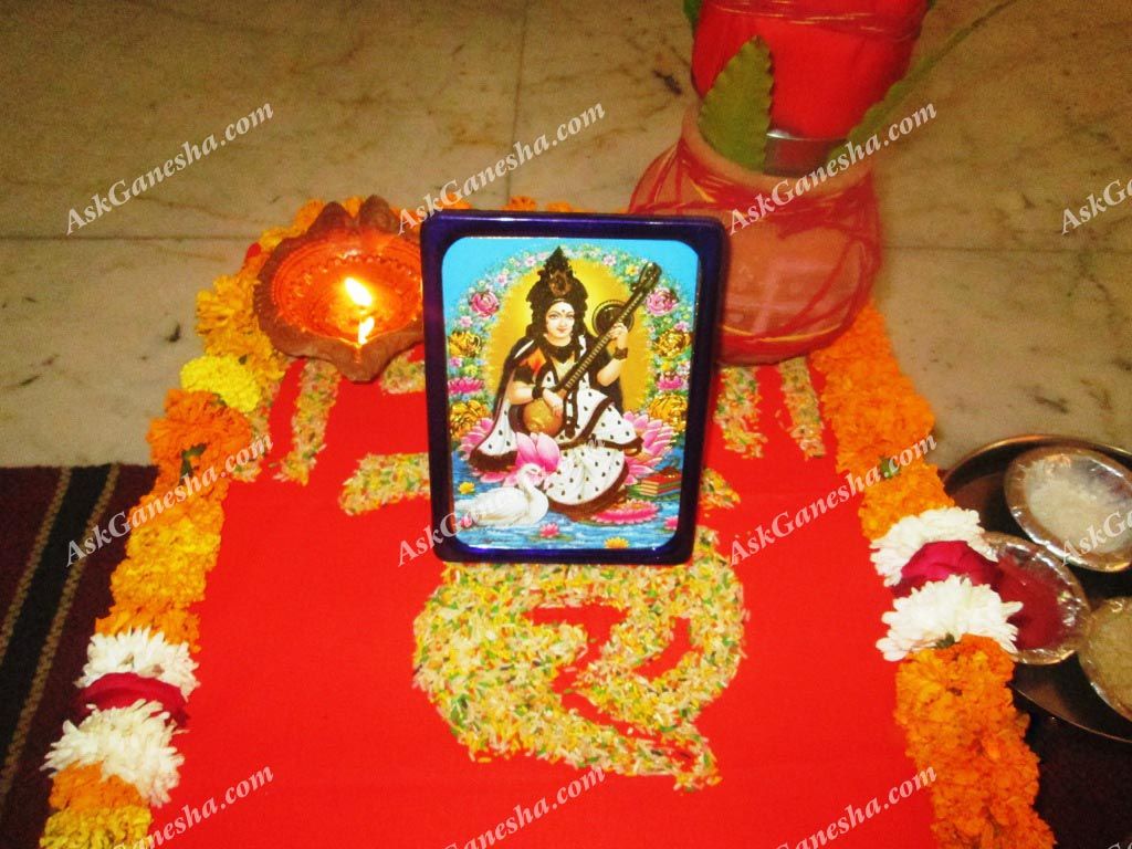 Shri Vidya Devi is offered clothes, the sacrifice of refined butter or ghee along with the chanting of her name, mantras and hymns dedicated to her.