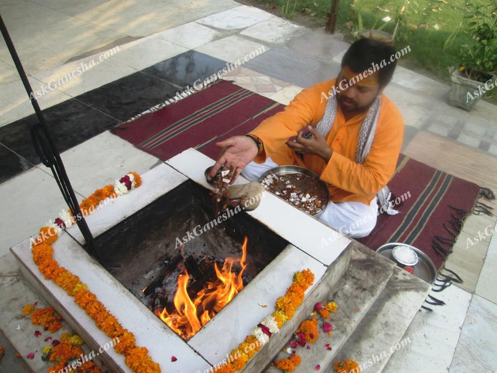 This is the first step of the Vidhi. In this step, the priests performing the yagna welcomes Lord Ganpati and other Gods and Goddesses through mantra chanting. This is an important part of the yagya as it builds the strength of the yagna and pooja. Avahaan is an attempt to invite the Lords to honour the yagna.
